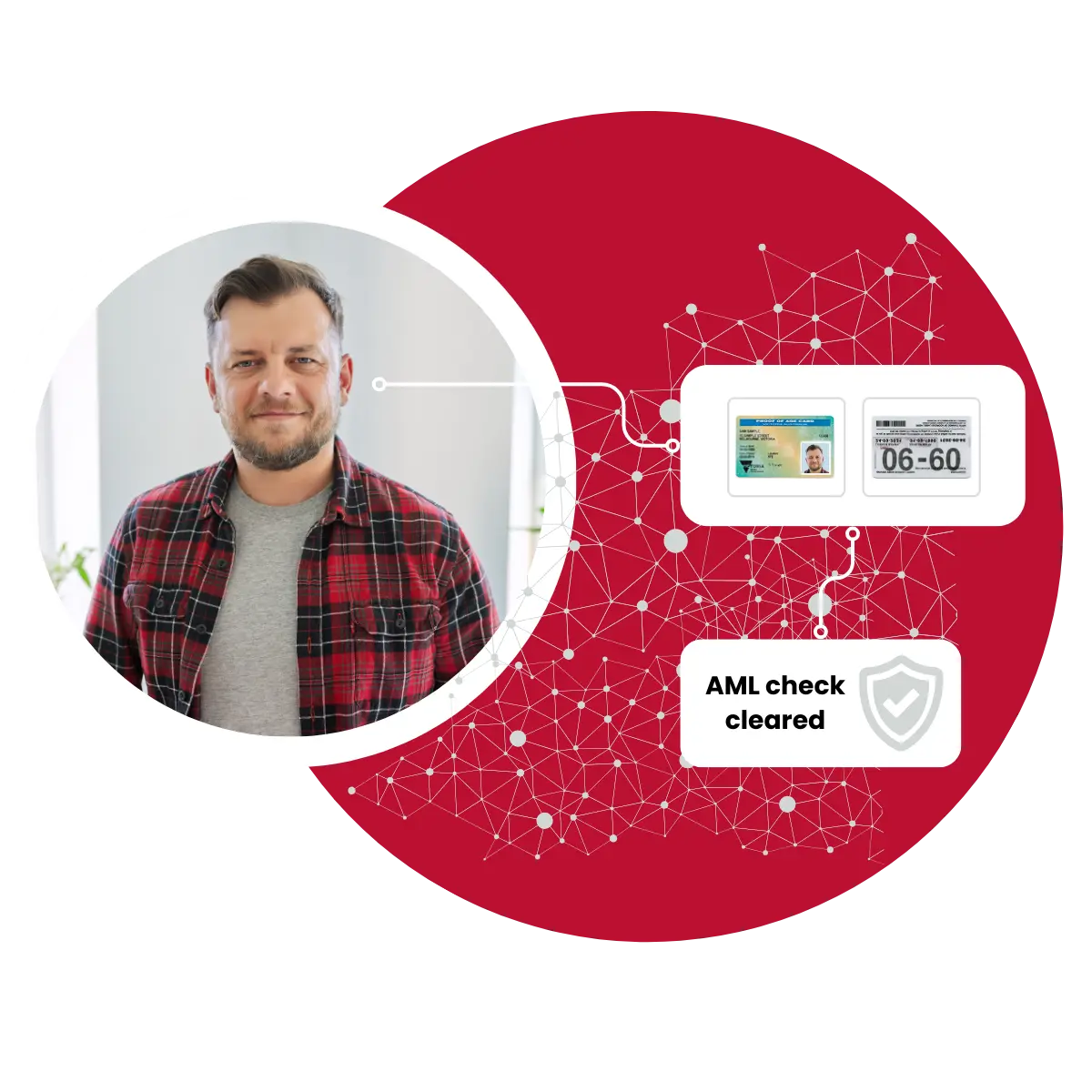 ID verification, biometrics, PEP and sanctions screening run in the background.