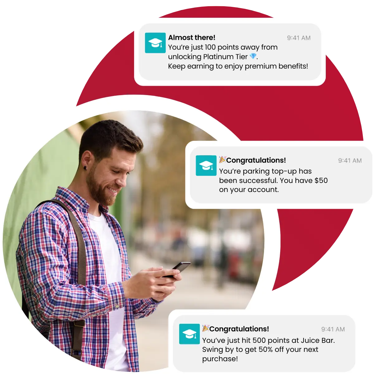 Keep your university top of mind with instant updates, reminders and rewards delivered straight to students’ phones.
